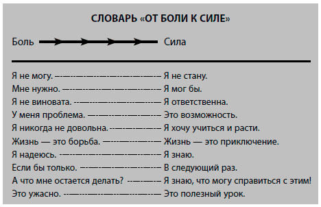 Чтобы легче и быстрее преодолеть путь, ведущий от боли к силе, важно, чтобы вы начали развивать свой словарь «От боли к силе». То, какими словами вы пользуетесь, потрясающе влияет на качество вашей жизни. Некоторые слова однозначно деструктивны; другие наделяют реальной силой. Сделайте для себя сознательный выбор, а затем реагируйте на словарь «От боли к силе» приблизительно следующим образом: