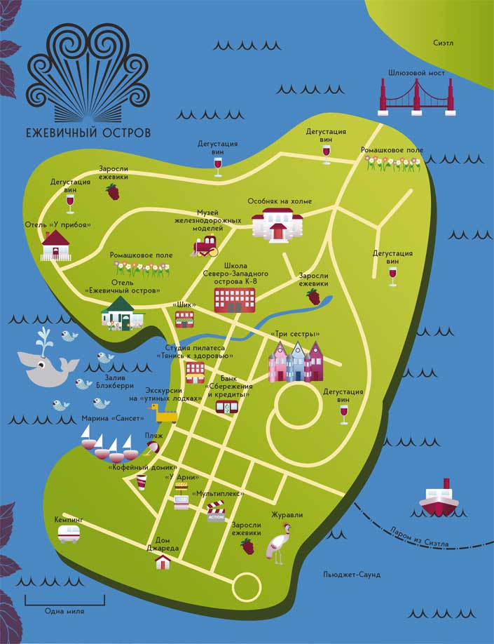 [Закрыть] в заливе Пьюджет-Саунд, соединенный с материком длинным мостом, может, технически и находился недалеко от Сиэтла, но это был совсем другой мир. Единственный городок на острове гордо именовал себя «Новой Англией Западного побережья». Мишель никогда не понимала зачем.