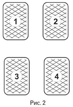Перемешайте карты, сосредоточьтесь, вспомните того, с кем вы хотите уточнить отношения или произнесите его имя вслух. Например: «Пусть покажется мое взаимоотношение с (имя)». Или: «Расклад карт делается на уточнение моих взаимоотношений с (имя)». Затем выберите машинально любые четыре карты (рис. 2).