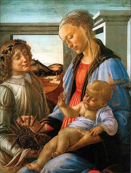 Образ Девы Марии с Младенцем занимал одно из центральных мест в творчестве флорентийских художников кватроченто. Этот сюжет встречается и в произведениях Сандро Боттичелли. На картине Мадонна одной рукой держит на коленях своего божественного сына, другой касается колосьев пшеницы, воткнутых в чашу с виноградом. Ангел, подающий ее, изображен в виде прелестного юноши с длинными каштановыми волосами, в одеянии церковного ученика. Чаша с виноградом, из которого получают вино, и зерном, из которого делают хлеб, является прямым символом таинства Евхаристии – причастия вином и хлебом как кровью и плотью Христа. Как это было принято, в образе Девы Марии с Младенцем художники Возрождения стремились передать не только один из начальных этапов Божественной истории, но и ее последующий ход, обозначенный знаками.
