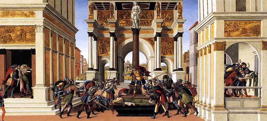 Боттичелли изобразил историю в нескольких последовательных эпизодах, происходящих вокруг римского форума.