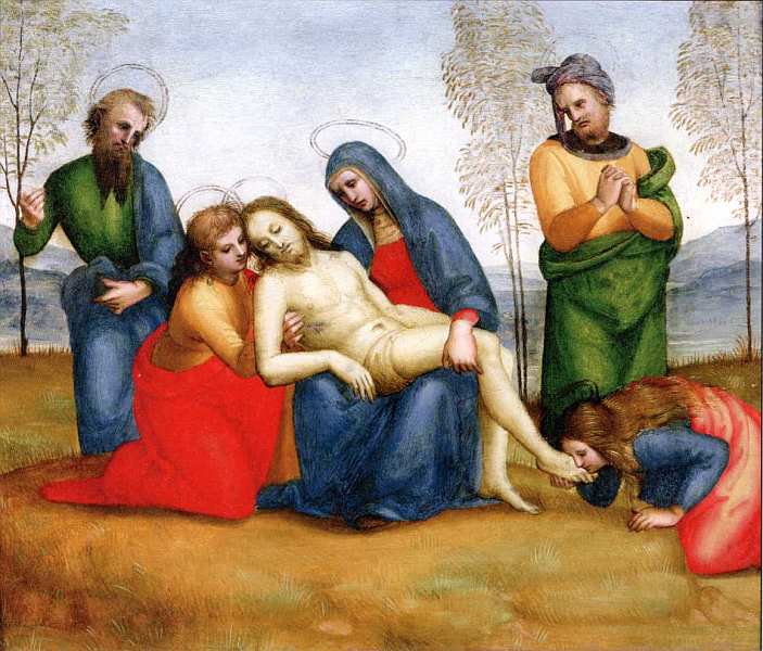 Рафаэль – величайший художник эпохи Возрождения. Данная картина являлась частью оформления пределлы в монастыре Святого Антонио в Перудже. Перед зрителем – сцена Оплакивания Христа Девой Марией (с итальянского слово «Пьета» означает «жалость, милосердие»). Одной из основных иконографических характеристик этой сцены считается положение, при котором мать держит на коленях тело умершего сына. Однако Рафаэль отошел от канонического решения, введя дополнительных участников, соединив два эпизода Страстей Христовых – Снятие с Креста и Пьету.
