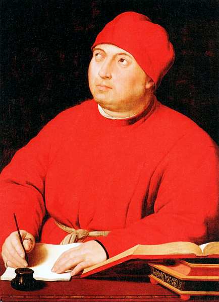 За свою короткую жизнь Рафаэль приобрел большое число почитателей и друзей. На данном портрете изображен друг мастера Томмазо Ингхирами, являвшийся прелатом (об этом свидетельствует его костюм – красные мантия и головной убор). Вместе с тем, несмотря на высокий сан, Томмазо был человеком общительным и вполне светским. Так, он носил прозвище Федра, которое получил за блистательное исполнение главной женской роли в одноименной трагедии Сенеки. Кроме того, из источников известно, что Ингхирами страдал косоглазием. Именно это заставило художника изобразить друга в столь необычном ракурсе – задумчиво смотрящим вверх, чтобы не акцентировать внимание зрителей на его дефекте. Присутствующие в картине мелочи раскрывают утонченную натуру Томмазо и его просвещенный характер – перстень на большом пальце, чернильный прибор, подставка под книгу и прочее. Данный портрет Ингхирами известен в двух вариантах, второй хранится в галерее Палатина во Флоренции.