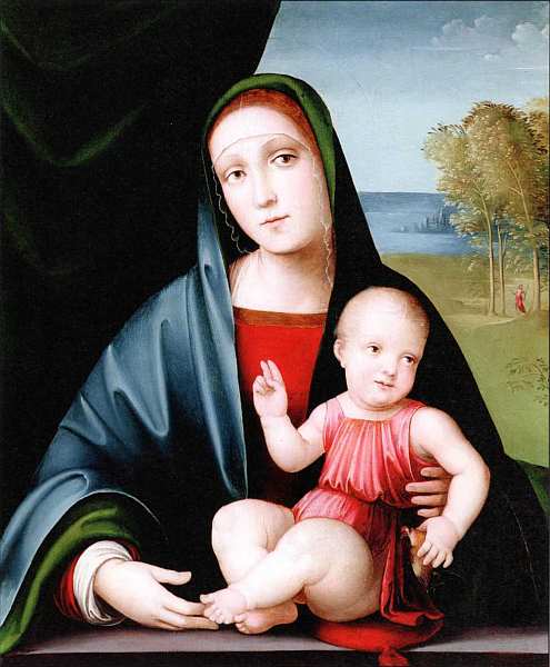 Данная работа относится ко времени пребывания ее автора в Мантуе. На картине изображены Дева Мария и Младенец на фоне пейзажа. Скорее всего, у творца не было конкретной модели, и он воспроизвел обобщенный образ молодой женщины. Перед ней расположена некая плоскость, на которой на красной подушечке сидит младенец. Взгляды матери и сына устремлены в разные стороны – они не пересекаются. Мадонна в задумчивости о будущем собственного ребенка; Иисус предвидит свою миссию, сложив пальцы в благословляющем жесте, Он поднял правую руку в крестном знамении, а левой держит щегла, символизирующего Страсти Христовы. Слева за спиной Марии – темная драпировка, справа художник поместил светлый пейзаж.