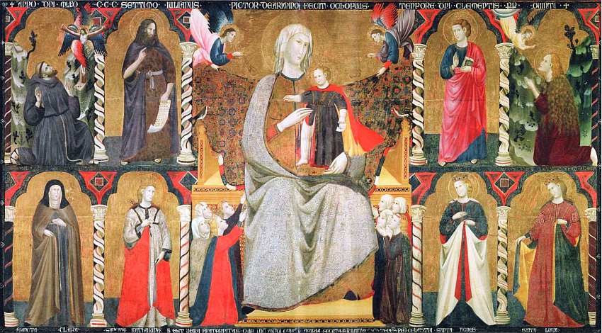 Джулиано да Римини (активен 1307–1346) Дева Мария на троне со святыми 1307. Дерево, темпера, золото. 179x320