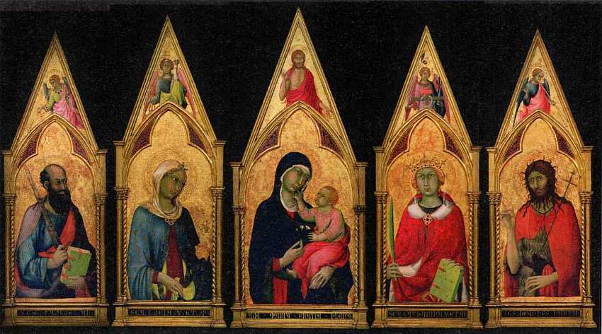 Симоне Мартини (около 1280–1344) Богоматерь со святыми. Около 1320. Дерево, темпера, позолота. Центральная панель – 99x60,7, боковые панели – 86,3x42,5
