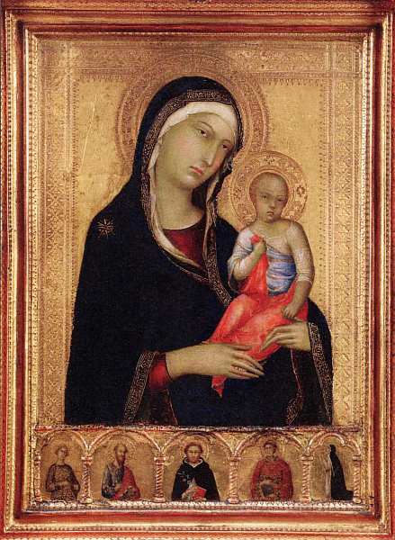 Симоне Мартини считается одним из ведущих художников Сиены и лучшим рисовальщиком с натуры начала треченто. Данное произведение было самостоятельной частью оформления пределлы в церкви. На нем изображена Дева Мария с Младенцем на руках. Согласно традиционной иконографии ее голова покрыта накидкой – мафорием, украшенным тремя звездами. Зрителю видна только одна вышитая звезда, на правом плече Мадонны. Иисус облачен в одежды трех цветов – белого, голубого и красного, символизирующих Его чистоту, святость и страдания. Божественный характер матери и ребенка подчеркивают нимбы и золотой фон. В нижней части произведения помещена пятичастная аркада – один из излюбленных композиционных приемов. Он изображает реальную архитектуру (в данном случае клуатр – крытую обходную арочную галерею, обрамляющую закрытый прямоугольный двор монастыря или крупной церкви), а примерно с конца IV века начинает символизировать Небеса (Небесный Град Иерусалим).