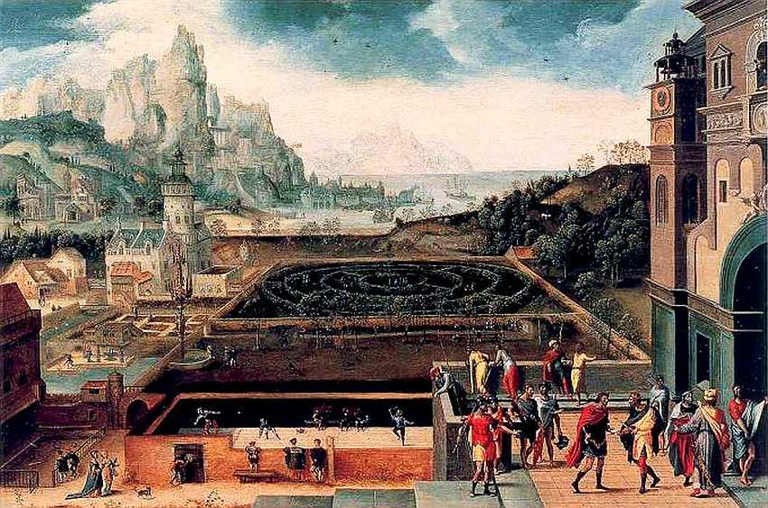 На данной картине – эпизод, когда царь Давид однажды увидел купающуюся Вирсавию (2-ая Книга Царств, 11). Он был восхищен ею и приказал доставить красавицу к себе во дворец. В это время муж Вирсавии Урия Хеттеянин находился в армии вдали от дома. Желая избавиться от законного супруга, Давид отправил начальнику войска, где служил Урия, письмо, в котором приказал поставить Урию в самое опасное место, чтобы его убили. На картине царь изображен дважды. Он смотрит из окна на бассейн, где купается Вирсавия, и в продолжение этой истории Давид показан на площадке перед дворцом, когда передает роковое письмо. Сюжет выбран художником так, чтобы можно было детально показать пейзаж – корт, где играют в теннис, парк-лабиринт, город, фантастические горы и далекое море.