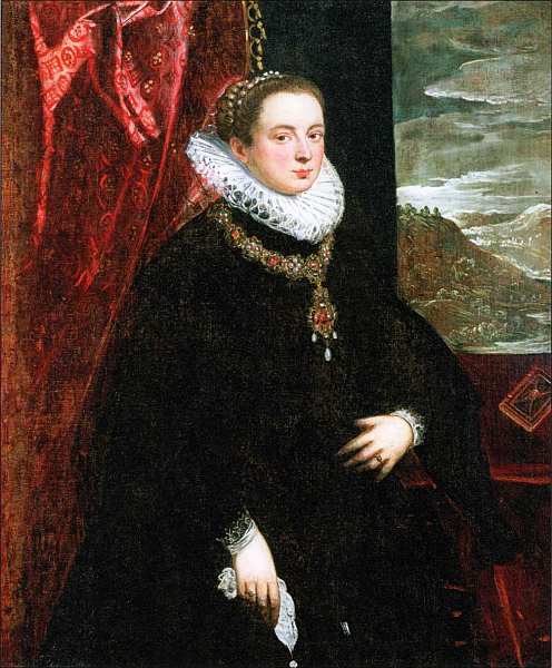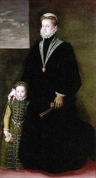 На картине изображена Джоанна Австрийская (1535–1573) – дочь Карла V. Она была замужем за Джоанном Португальским, умершим еще до рождения их сына в 1554. В этом же году брат, Филлипп II, отозвал Джоанну в Испанию в связи с его отъездом в Англию и женитьбой на Марии Тюдор. Джоанна Австрийская стала регентом Испании. После смерти Марии Тюдор Филлипп II вынужденно уехал из Англии, где его не принял парламент. Однако Джоанне не суждено было вернуться в Португалию и увидеть своего сына. В Испании она занималась активной религиозной деятельностью. На портрете властительница показана в строгом черном платье с орденом Святой Клариссы на груди, покровительственно прижимающей к себе девочку в богатом одеянии.