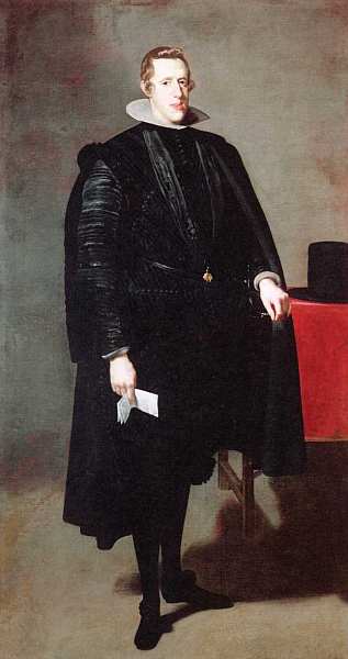 Перед зрителем – один из многочисленных портретов короля, созданных Веласкесом за время своей службы. Молодой Филипп IV изображен в черном костюме идальго с орденом Золотого руна на груди. Фамильные особенности Габсбургов – удлиненные пропорции тела, крупные черты лица – переданы с откровенной прямотой, но благодаря тому, что акцент сделан также на светлых кистях модели, вся фигура выглядит пропорциональной и уравновешенной.