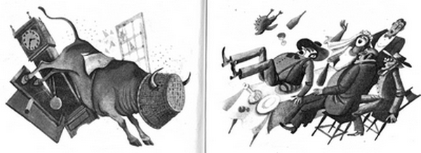 Белый Носок, наконец, добрался до черного хода в дом и постучал по двери хвостом, при этом нечаянно сорвал ее с петель и вломился в дом. По неловкости он наскочил на старинные голландские часы, стоявшие на полу, зацепил ненароком маятник, и часы полетели на пол, а вместе с ними колесики и шестеренки тоже покатились что куда, и пчелы бросились их догонять. Попятившись задом, бык задел ножку кровати и опрокинул ее. Взбрыкнув, он отправил ножку от кровати прямо в окно. Следующий его шаг хвостом вперед был к буфету, украшенному по углам резными кошечками. От столкновения тот грохнулся на пол, и бедному быку ничего не оставалось, как растоптать и превратить в кашу все, что стояло в нем на полках.
