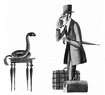 Не зная, как лучше поступить, Джонас решил на всякий случай подружиться с гремучкой. Он потихоньку встал, вынул из своей обеденной сумки кувшин с молоком, налил немного в жестяную кружку, поставил ее на пол и хотел уж было пригласить змею отведать угощение, но вот беда, он не знал, как к ней обратиться. Не мог же он ей сказать: «Послушай, змея!» Получилось бы невежливо.