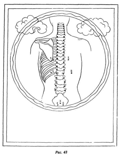 Сразу над нижним закруглением лопаток находятся две точки для надавливания (точки 1,рис. 43). Средними пальцами надавливайте на эти точки одновременно либо поочередно. Установите экспериментальным путем, какой способ лучше для вас. Медленно усиливайте и ослабляйте давление.