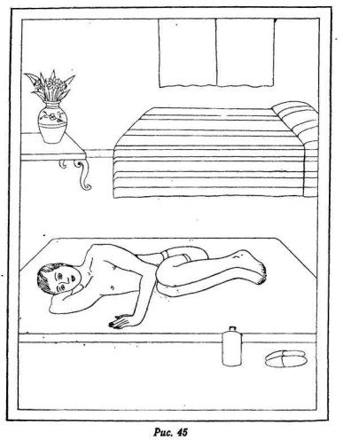 Лягте на пол на правый бок; ноги должны быть достаточно прямыми, левая нога впереди правой. Массируйте обеими руками сначала талию, затем левые бок и ягодицу в направлении ноги. Попробуйте массировать также и кулаками. Небольшие круговые движения костяшками помогут снять напряжение.