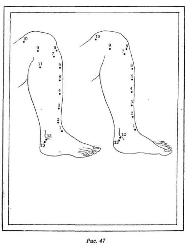 Массируйте область вокруг колена, в четырех углах коленной чашечки, по бокам колена и под коленом. Большими пальцами надавливайте четыре группы точек на колене и вокруг колена (точки 7—10,рис. 47). Если вы сначала не найдете эти