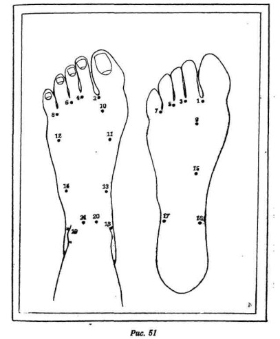 Большим пальцем или костяшкой массируйте участки, где пальцы ног соединяются с подошвой. Надавливайте на четыре пары точек между косточками, показанные на рис. 51 (точки /– 8),используя большой палец со стороны подошвы и средний на верхней стороне стопы.