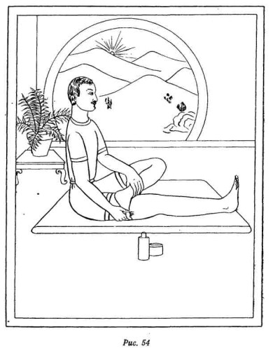 Сядьте, вытяните ноги перед собой, ладонями слегка обопритесь о пол рядом с боками. Расслабьте ноги как можно больше. Согните правую ногу в колене и поставьте ее пяткой на левую ногу около паха. Массируйте правой ногой и ее подошвой левую ногу, совершая движения вокруг, вверх и вниз по всей длине левой ноги и по ее бокам. Выполняйте массаж несколько минут. Затем перемените положение ног и таким же образом массируйте левой ногой правую.
