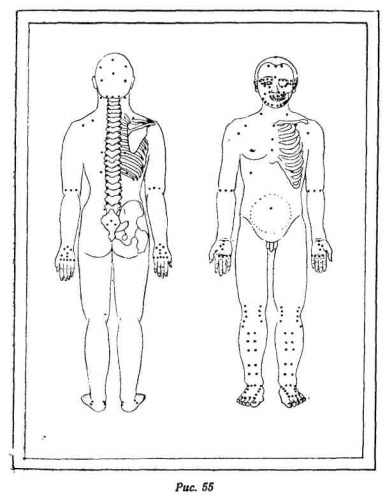 На рис. 55 показаны все точки для надавливания, упомянутые в данной главе. Схема этих точек, равно как все упражнения и массаж Кум нье, является картой, с помощью которой вы исследуете внутренние богатства, заключенные в ваших теле, уме и сфере ощущений. По мере ознакомления с этими точками и с особыми качествами чувства, вызываемого надавливанием на точки, ваше понимание сущности воплощения углубится. В ходе вашего исследования вы сможете открыть дополнительные точки для надавливания (даже внутренние). По мере успешной практики вы сможете составить карты, основанные на ваших собственных переживаниях в сфере тела и ума, и использовать эти карты для помощи другим.