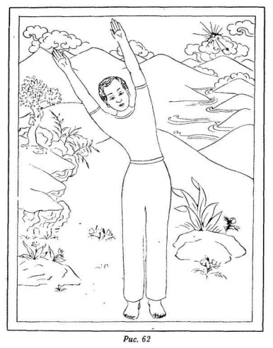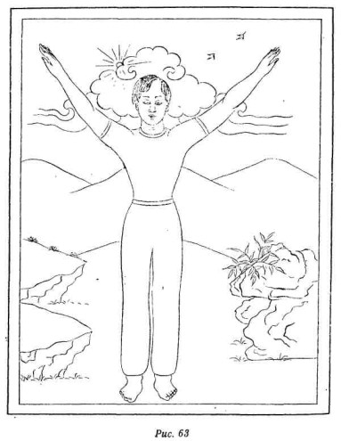 гию из сердечного центра наружу через пальцы. Наращивайте поток энергии в постоянном медленном ритме. Когда руки окажутся прямо над головой, слегка потянитесь вверх, поддерживая бедра и ноги как можно более расслабленными. Это потягивание очищает и нормализует ум; в этот момент погрузитесь глубоко в свои ощущения.