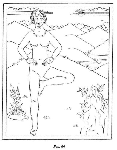 Станьте босиком на пол или землю, расставьте ноги на удобное расстояние и выпрямите спину. Медленно поднимите левую ногу, согнув ее в колене. Обхватите внутреннюю сторону ноги около лодыжки левой рукой и подтяните подошву к внутренней стороне правого бедра под промежностью. Слегка уприте пятку в бедро, чтобы зафиксировать ее в выбранной позиции. Отставьте левое колено в сторону, медленно положите руки на бока, -устремите мягкий взгляд перед собой, уравновесьте себя в этом положении и слегка сосредоточьтесь. Перераспределите часть веса на левое колено и ослабьте мышцы живота. Оставайтесь в этом положении 1—3 минуты. Не меняя положения и не теряя равновесия, медленно ослабьте давление левой ноги на правое бедро, пока оно не станет почти нечувствительным.