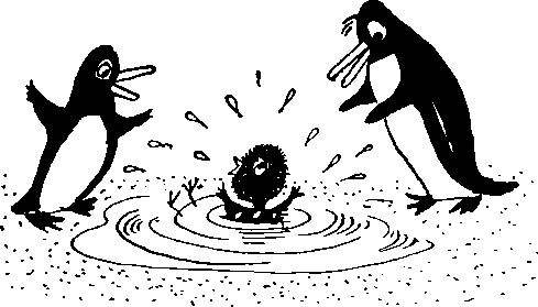 На отчаянный писк прибежали пингвинята Пинг и Кинг, вытащили бедняжку, положили сохнуть на солнышко.