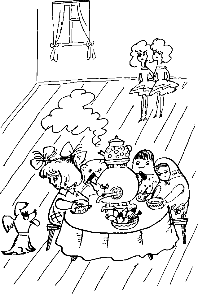 Обе расстроились: ах, какая гадкая эта Наташа! Все играют с ней в прятки, в жмурки, сажают за стол. Матрёшки несут пироги, Ванька-Встанька – самовар, Обезьянка – пакет с конфетами. Хлоп! – конфеты на полу. Хорошо, что они в бумажках! Все смеются. Гости помогают подобрать конфеты. Пёс хотел съесть одну вместе с бумажкой, а Наташа не позволила: