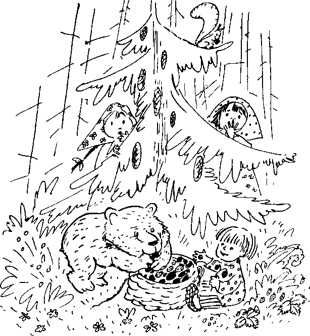 И тогда на поляну с одной стороны выскочили Мотя с Настей, а с другой – ещё один зверь, ростом с нашу Бурёнку. Сестры как закричат, схватили Федотика, Федотик – меня – и наутёк. А большой зверь как зарычит, хвать маленького! – и тоже наутёк. В другую сторону, только ветки затрещали.
