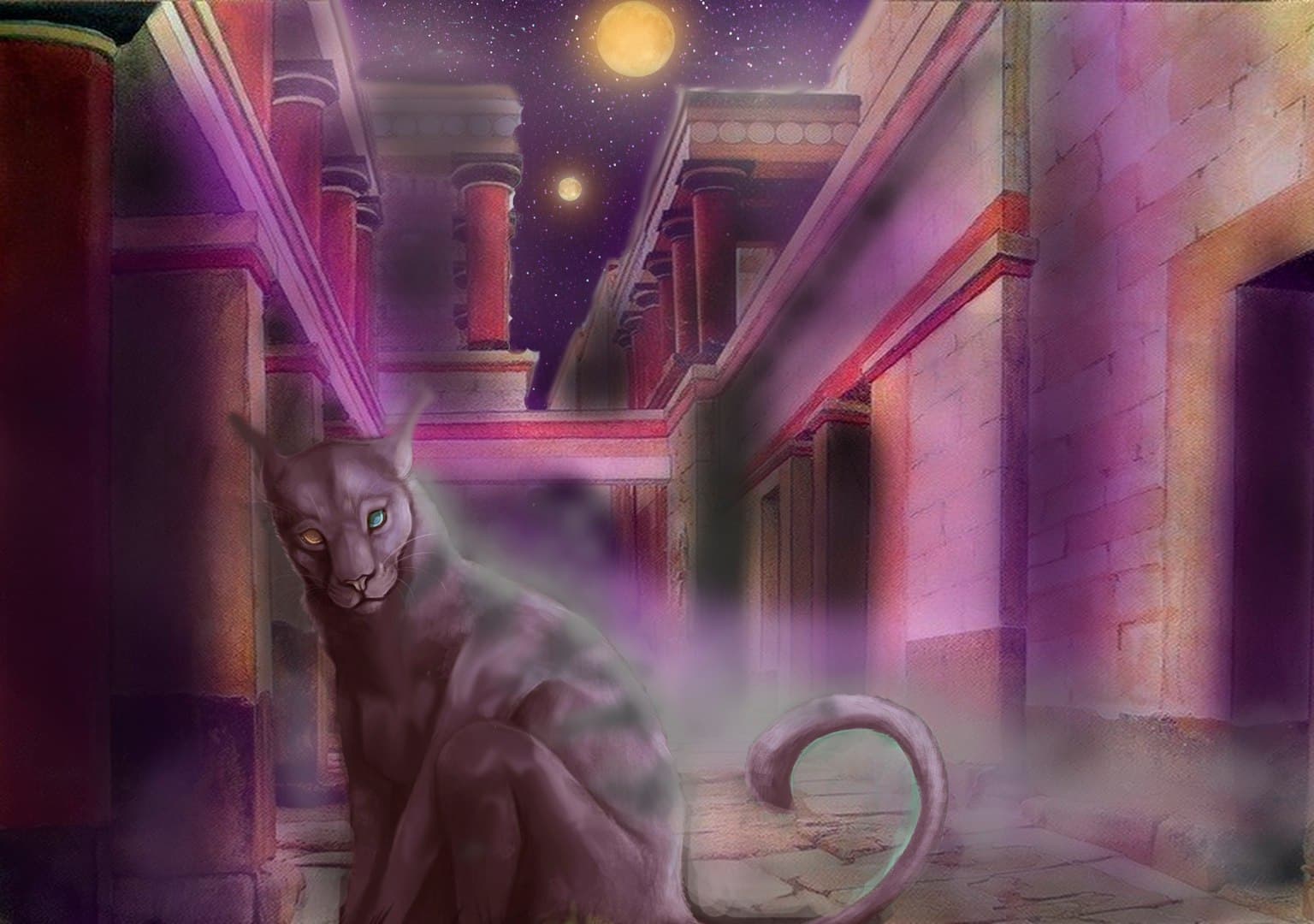 Роу-су, ленивый, как все кошки, дремал, вытянувшись во весь свой рост на высоком ложе с подстилкой из стеблей травы. Необычного для этого вида сивого окраса густая шерсть в свете взошедших лун отливала серебром, одна из передних лап свесилась вниз. Гибкий хвост с львиной кисточкой на конце и длинные белые усы подрагивали во сне. Чуткие треугольные уши ловили каждый звук.
