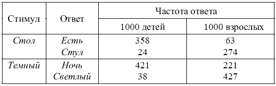 • Возрастные особенности ассоциаций. Типы ассоциаций изменяются с возрастом. Это убедительно доказывает эксперимент Вудвортса и Шлосберга, проведенный в 1960 г. на материале английского языка (табл. 2). Самая частотная реакция взрослых на стимул стол – стул (парадигматическая реакция), у детей – есть (синтагматическая), на стимул темный у взрослых – светлый, у детей – ночь.