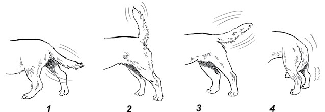 Хвост. Если хвост расположен чуть ниже нейтрального положения, мягко виляет от самого основания с широкой амплитудой (1) – вы видите перед собой расслабленную собаку.