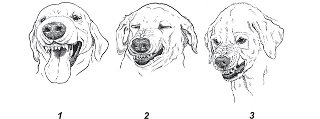 Три типа оскала (для корректной идентификации сигналов состояния собаки анализируйте поведение в комплексе): 1 – улыбка (верхняя губа поднимается по центру, тело и взгляд мягкие, собака смотрит на хозяина и стремится к нему); 2 – собака демонстрирует сигналы успокоения (уголки губ оттянуты назад, глаза прищурены, уши заложены назад); 3 – собака демонстрирует сигналы агрессивного поведения (уголки губ вытянуты вперед, переносица в складках, взгляд жесткий, видны белки глаз, уши направлены вперед, напряжены)