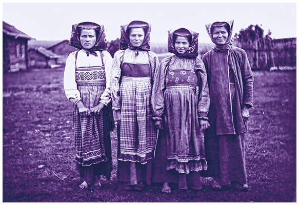 Этнография коми-пермяков. Группа женщин в национальной одежде. Фотонегатив стеклянный. Конец XIX – начало XX в.