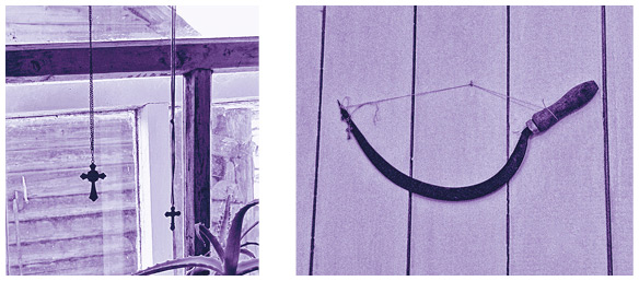 Слева: Крестики для черешлана. Село Пуксиб Косинского района Коми-Пермяцкого округа. Их брали для исполнения обряда, некоторые проводили обряд у окна. Справа: Серп для черешлана. Поселок Сергеевский Гайнского района Коми-Пермяцкого округа. Во время ритуала черешланница держала серп на пальце или куда-нибудь подвешивала