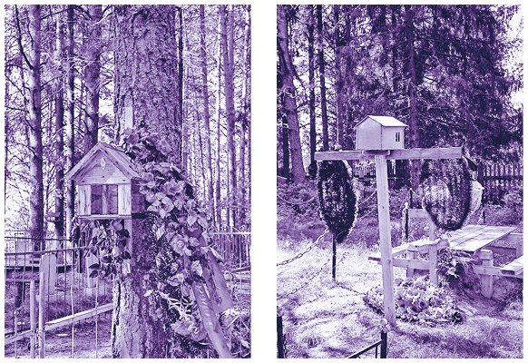 Кормушки для птиц («конурки») на дереве и кресте. Кладбище села Летка.