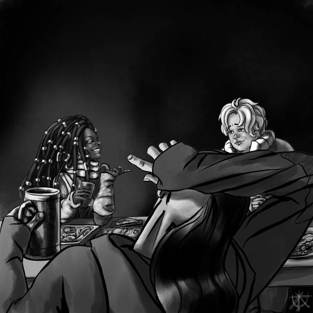 Горец не ответил, а новый знакомец, дохнув перегаром, уставился на ученика лекаря. Тот наконец смог рассмотреть татуировки на его вытянутом лице: два треугольника походили на щегольскую бородку, по впалым щекам до нижней челюсти и к ушам шли по три полосы, как усы лесного кота, брови тоже были забиты, и над носом от них поднимались острые линии, делая довольно открытый взгляд хмурым, да ещё такому видимому настроению добавляли мрачности подчёркивания под нижними веками, соединённые с наружными углами глаз. В правом ухе у Корвуса болталась длинная серебряная серёжка, похожая на женскую, а причёской напоминал Чиёна: чёрные волосы остались лишь над высоко выбритыми висками. Длинные, почти до лопаток, они гладкой волной лежали на одном плече.