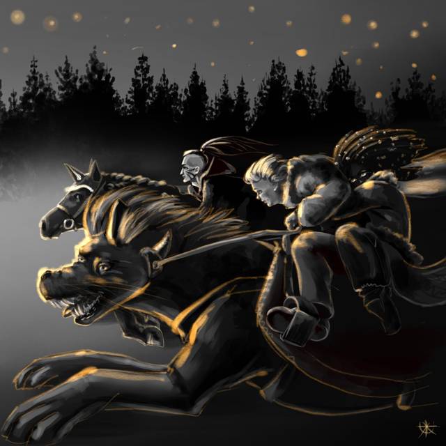 Ночь спускалась студёной смолью, Корвус, как и было обещано, заливался вином. Ему не мешали ни ветер, ни тьма, ни высокая скорость, ни даже низкие ветви деревьев, когда тракт с голых равнин свернул в лес. Звери дважды сами, без команды, останавливались у воды и пили, а после бежали дальше. Бурун вёл, находясь то рядом, то на полкорпуса впереди. Хойхо поначалу пытался обогнать сноровистого жеребца, но когда у уха клацнули зубы, признал его роль ведущего.
