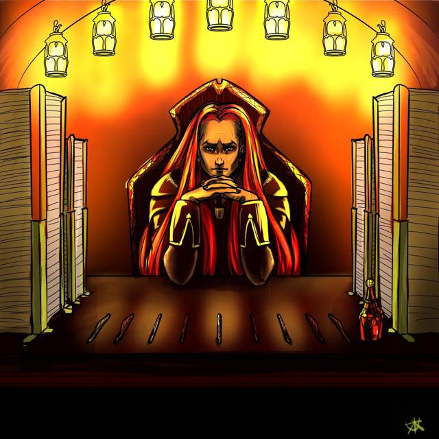 В кабинете царил стол. Большой и массивный, почти от стены до стены, с аркой фонарей над ним и колоннами бумаг в деревянных и стальных скобах, прикрученных к столешнице. Чернильницы и перья, как солдаты, выстроились в ряд по переднему краю, занимая небольшие углубления в полированном до блеска дереве. Кончики перьев направлены на дверь, как копья стражей. Стены багряно-чёрные, будто из бархата, поглощали свет, выделяя лакированный стол. А за ним, в обрамлении фонарей и бликов от них, сидел мужчина.