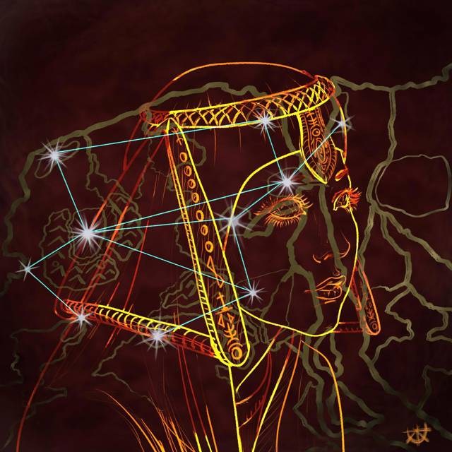 …Темнота. Снова мозаичные глаза на бледном, будто кукольном лице. Но уже постарше. Едва слышен скрип и шелест кожистых крыльев, рваный блеск покачивающихся золотых треугольников по обе стороны всё ещё не взрослого лица.