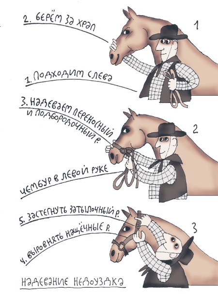 2. левой рукой подносим недоуздок к морде лошади и, помогая себе правой рукой, надеваем переносный и подбородные ремни. Сложенный чембур остается в левой руке;