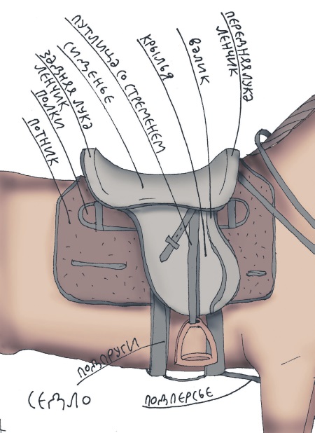 Итак, седло в сборе состоит из: ленчика (арчака), двух крыльев, двух подкрылков, сиденья, двух подушек, двух подпруг, четырех приструг, двух путлищ, двух стремян, двух шнеллеров и потника или вальтрапа. Вальтрап, строго говоря, частью седла не является, а подпруги, путлища и стремена входят в т. н. седельный сбор.