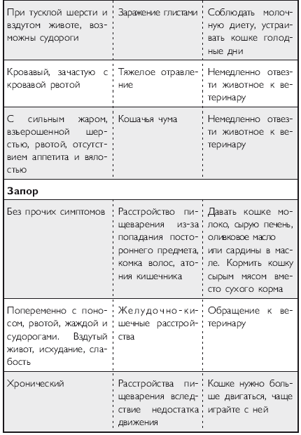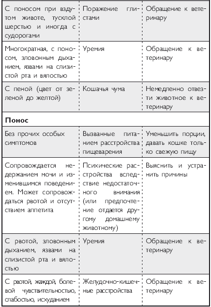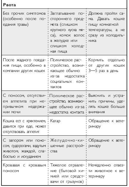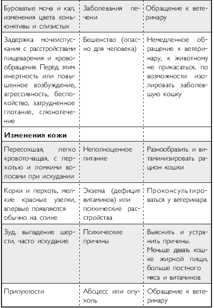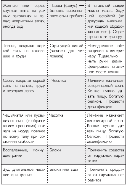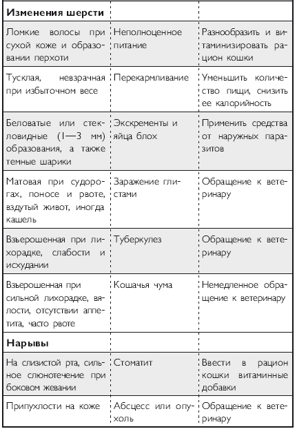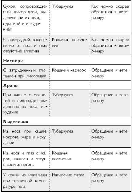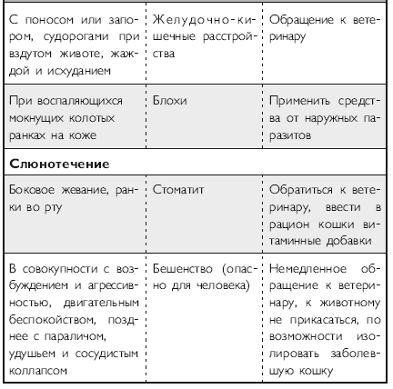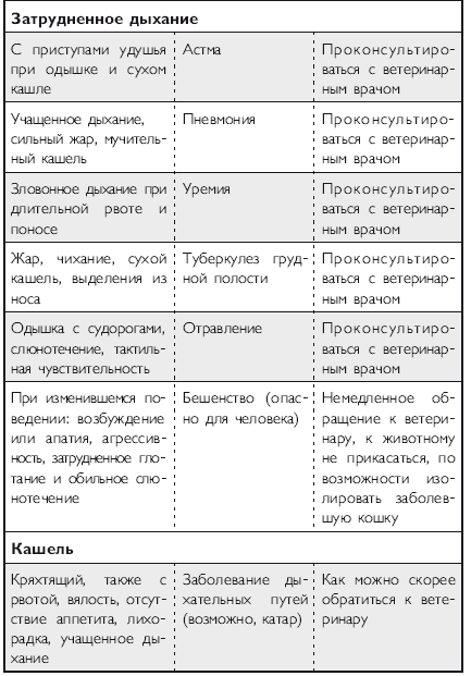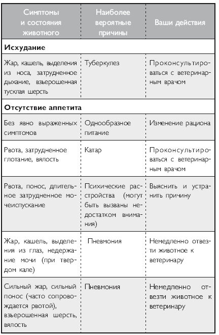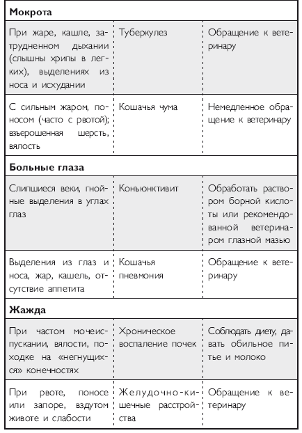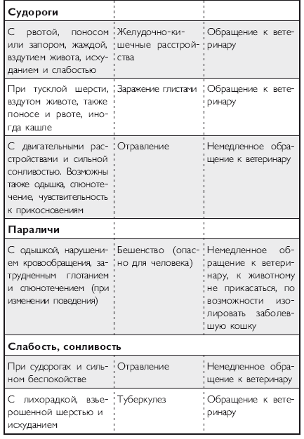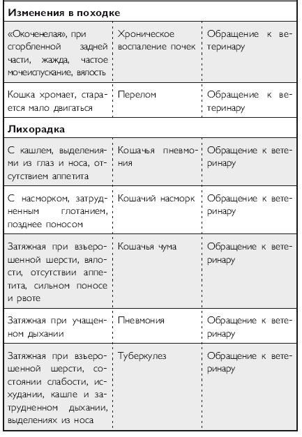 Помимо вышеперечисленных напастей вашего питомца на протяжении всей его жизни могут подстерегать и «обычные» заболевания. Это могут быть болезни органов дыхания и пищеварения, отравления, ранения, травмы, болезни суставов, сердечно-сосудистой, иммунной и нервной систем. На эту тему российскими и зарубежными авторами написано множество специализированной ветеринарной литературы, поэтому я не буду здесь пускаться в подробное описание многочисленных кошачьих недугов. Приведу лишь необходимый минимум, если хотите, своего рода «шпаргалку», необходимую каждому кошко-владельцу. Эта таблица была разработана американскими учеными-зоологами и содержит наиболее часто встречающиеся симптомы различных заболеваний у кошек.