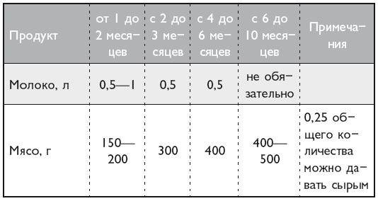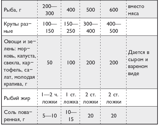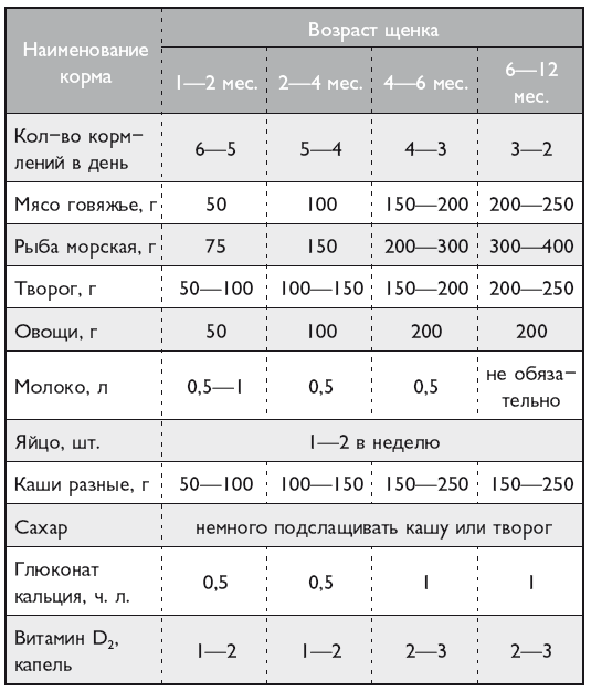 Рацион щенка должен быть как можно более разнообразным, чтобы в дальнейшем выросшая собака была приспособлена к разнообразной пище. Нужно помнить, что чем старше щенок, тем сложнее будет приучить его к новому рациону. В корм щенкам желательно добавлять свежую зелень: молодую крапиву (предварительно ошпаренную кипятком и мелко порубленную), капусту, свекольную и морковную ботву и т. п. Обязательно нужно давать рыбий жир (начиная с нескольких капель и до 0,5–1,5 чайных ложек в день). В корм также нужно добавлять тривит и глицерофосфат кальция. Практикой выращивания племенных собак установлены примерные следующие нормы кормления молодняка по месяцам:
