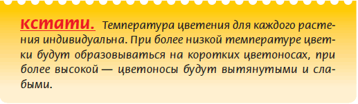 У большинства культур цветение наступает на 20–30-й день после их установки в оптимальные условия выращивания. В этот период температуру поддерживают в пределах 16–18 °C, а при снижении температуры до 10–12 °C можно добиться более продолжительного цветения. В это время растения нуждаются в более обильных поливах и постоянном притоке свежего воздуха (чаще проветривайте помещение). После окончания цветения полив постепенно сокращают, а с пожелтением листьев – полностью прекращают.