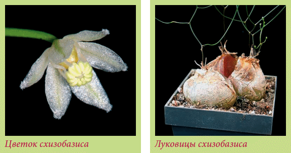 Схизобазисв переводе с латинского – растение с расщепленным основанием. Схизобазис отличается от бовеи опадающими при развитии плода частями околоцветника. Период роста – лето, цветет с июня по август. Растение легко размножается посевом, но сеянцы еще более чувствительны к мушкам-сциаридам, нежели сеянцы бовеи.