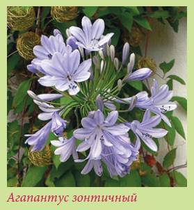 Агапантус зонтичный (Agapanthus umhellatus). Растение очень светолюбиво, и летом из комнаты агапантус желательно выносить в сад или на балкон (иначе может не зацвести). При создании оптимальных температурных условий обильно цветет каждый год, семена же вызревают не всегда, а лишь в очень жаркое лето. В период активного роста необходимо поддерживать высокую влажность, а также подкармливать растворами минеральных и органических удобрений, можно куриным пометом (1:25) или коровяком (1:10), цветение тогда будет особенно пышным. Зимой полив ограничивают.
