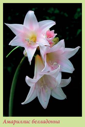 Амариллис белладонна (Amaryllis belladonna). Растение луковичное, декоративноцветущее с отмирающими в период покоя листьями. Луковица округлой, слегка вытянутой формы, диаметром 4–5 см. Листьев у взрослых растений 12–16. Они ремневидные, длиной до 50 см и шириной 2,5 см. Цветоносы высотой 50–60 см, плотные. Цветки очень декоративные, яркие, крупные, до 10–12 см в диаметре, собраны по 4–12 в зонтик, воронковидные, чаще ярко-розовые, пурпурные, иногда белые, ароматные. Каждый цветок цветет до шести дней. Плод – сухая трехстворчатая коробочка с 6 и более округлыми зеленоватыми семенами. Цветет в апреле-мае.