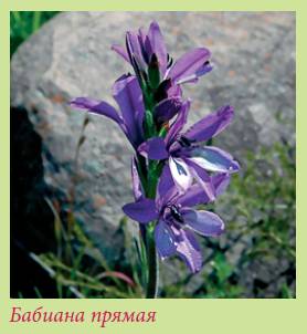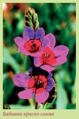 Бабиана складчатая (Babiana plicata). Форма цветка трубчатая, лепестки фиолетовые с белым или желтым пятном. Бабиана красно-синяя (Babiana rubro-cyanea). Цветки розово-малиновые с красным зевом. Очень редкое растение.