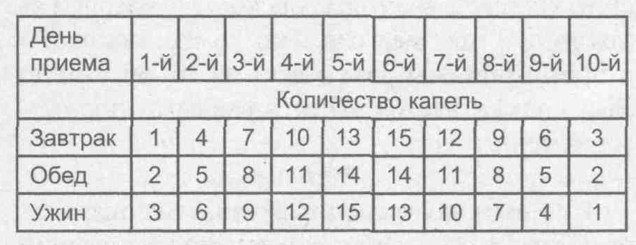 С 11 -го дня препарат принимают по 25 капель 3 раза в день до конца месяца (30-го дня). Затем следует перерыв 5 месяцев, и курс повторяется.