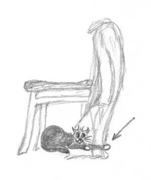Зараза Хэпка любила такую игру. На одном стуле часто висел халат, он свисал до пола. Когда к нам приходили гости, киса пряталась под халатом и высовывала белый кончик лапки. Гость думал, что уронили ватку, нагибался её поднять – и тут в него впивались когти. Мы сами быстро просекли фишку и перестали вестись на ватку, но гости попадались регулярно.