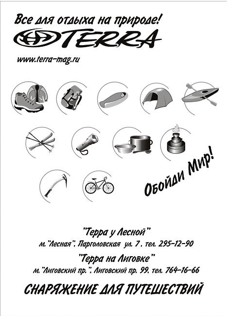 Следующей по объёмам аска была питерская «Терра». За страничку с рекламой в наших многочисленных книгах она давала много разной снаряги, только вот одежды у неё не было. Разнообразные рюкзаки распределились по хорошим знакомым, у некоторых живы до сих пор. А теперь я даю их рекламу в своих книгах уже просто так, по старой памяти. Они мне тоже много чего просто так делают.